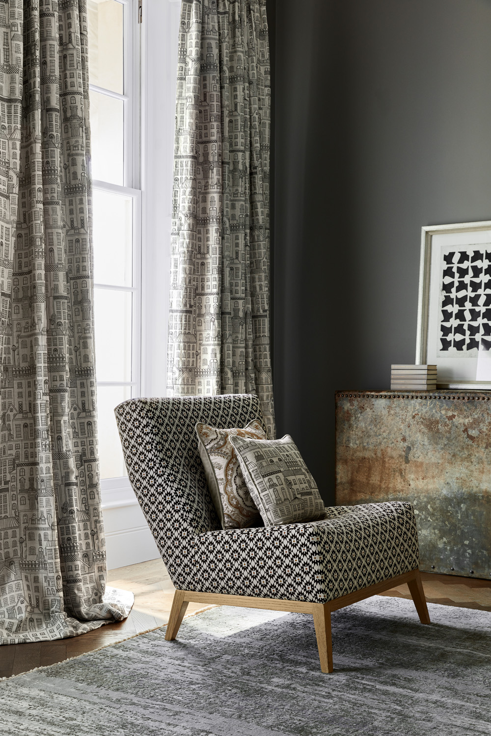 A striking geometric upholstery fabric with a design that has sharp jazzy edges and chenille pops of colour detail in the centre of each shape that picks up on the tones throughout Fitzrovia.