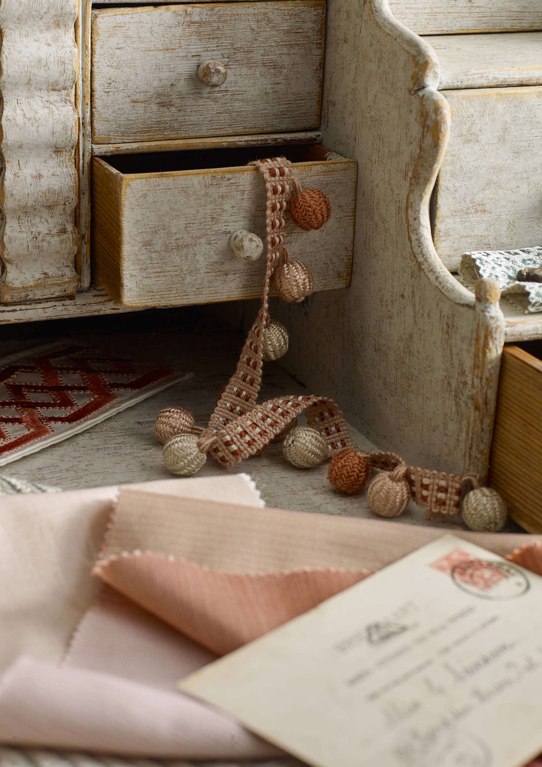 A new twist to the decorative drop trim and a first for the James Hare passementerie collection. This design is both fun and colourful combining different tones within each colour palette. Whether edged along curtains, cushions or upholstery, this trim is a lively detail for a finishing touch that will be noticed.
