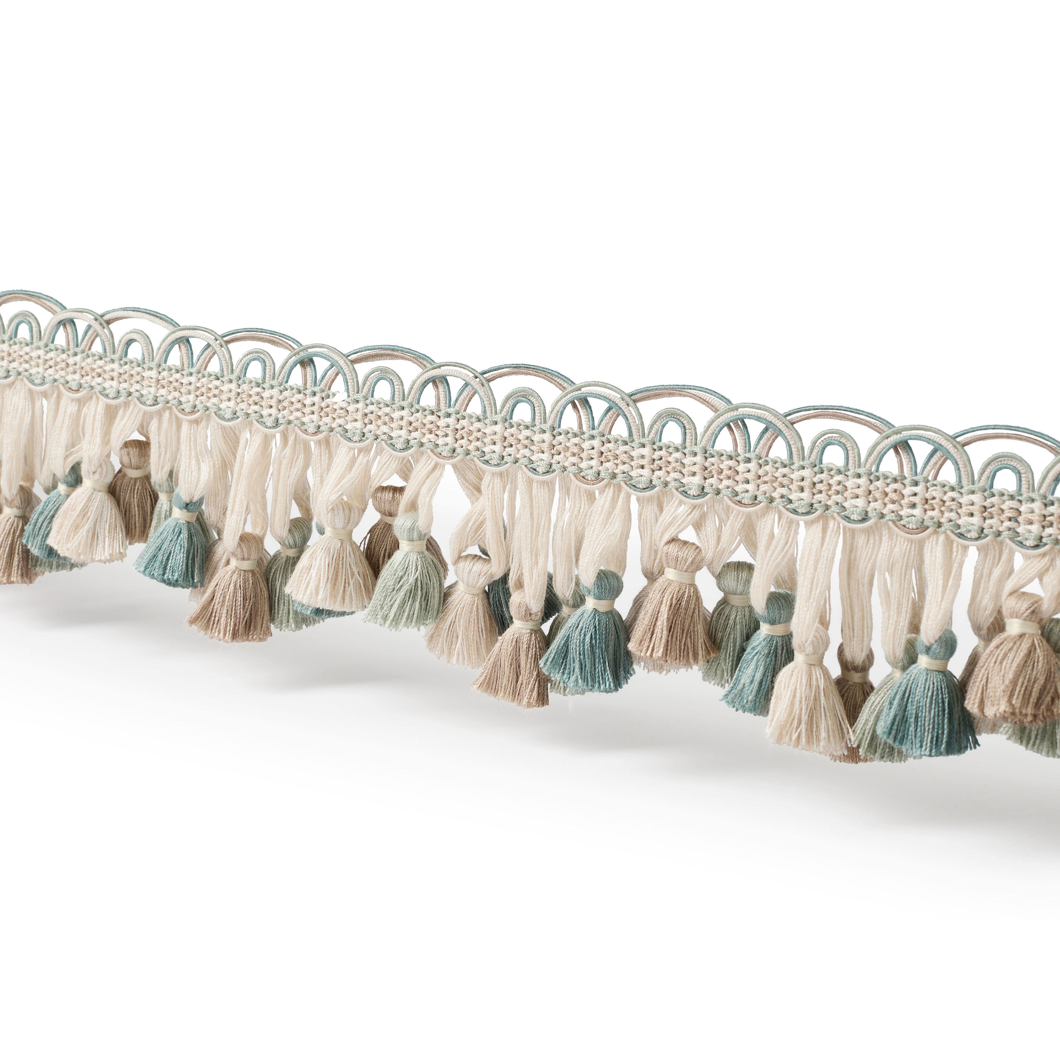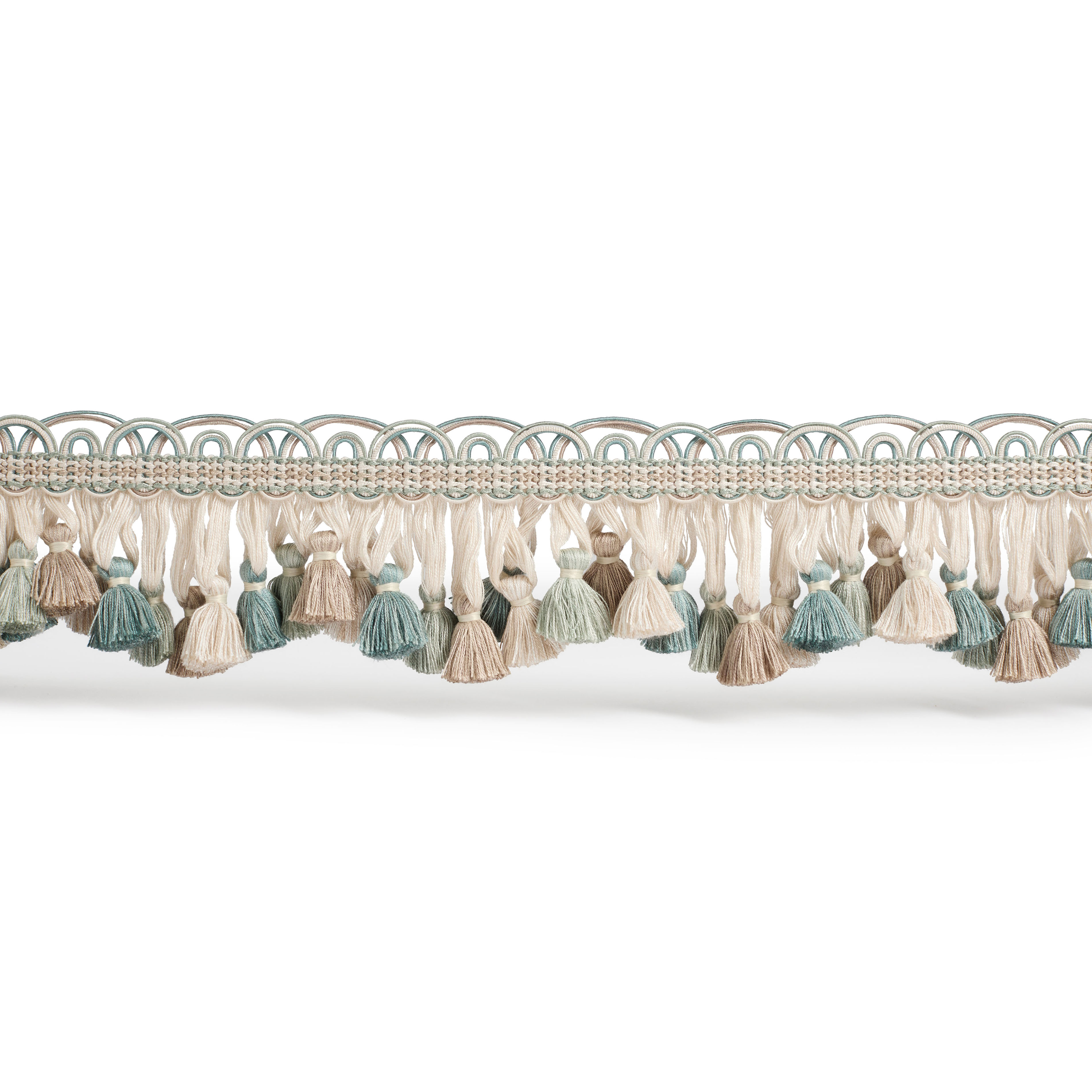 Ophelia Scallop Tassel Fringe is an exquisite ornamental trim that brings movement, colour and texture to any design. Featuring a delicate braid along the top, it cascades into a graceful wave of tassel drops in beautifully graduated colours, creating a sense of rhythm and elegance.
