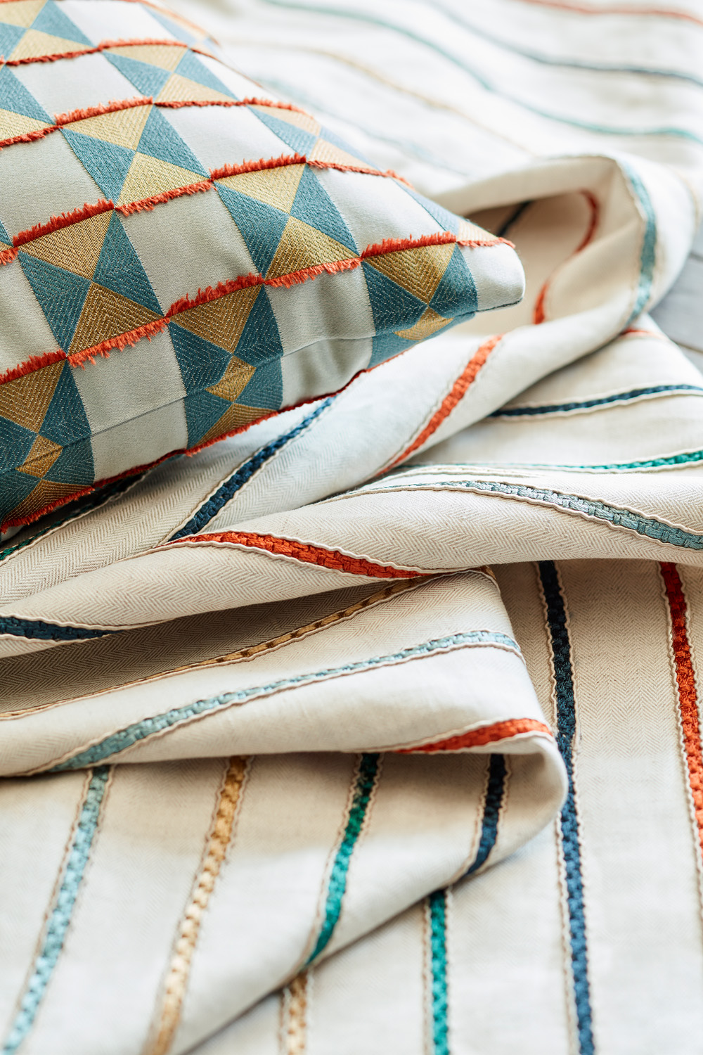 Rich tones of bright teal, orange and navy in elegant repeat patterns.