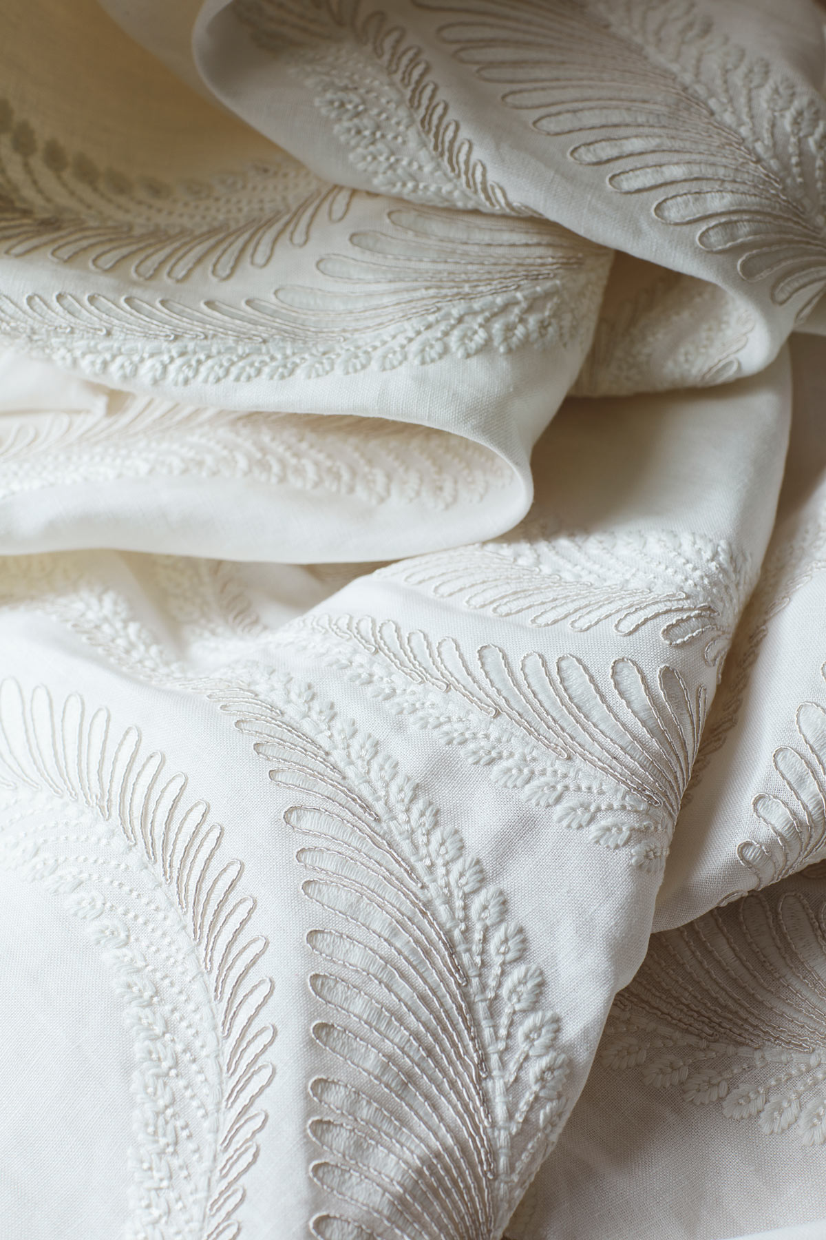 Meander combines decadent stitch with rich corded details that creates raised texture and richness. An extravagant trellis design that flows seamlessly and effortlessly over a natural linen ground in a sinuous trail, it is very calming, elegant and beautiful.
