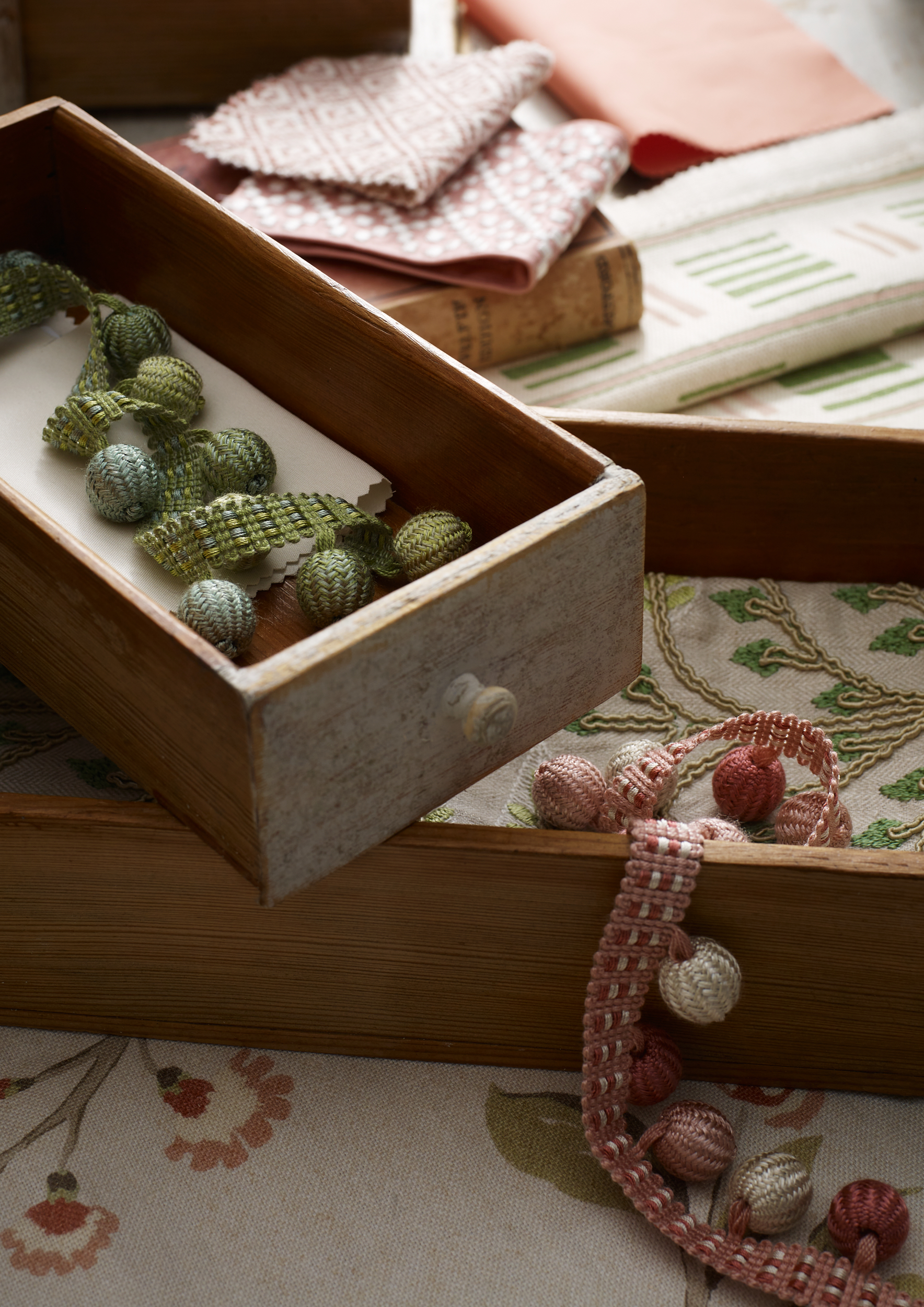 A new twist to the decorative drop trim and a first for the James Hare passementerie collection. This design is both fun and colourful combining different tones within each colour palette. Whether edged along curtains, cushions or upholstery, this trim is a lively detail for a finishing touch that will be noticed.