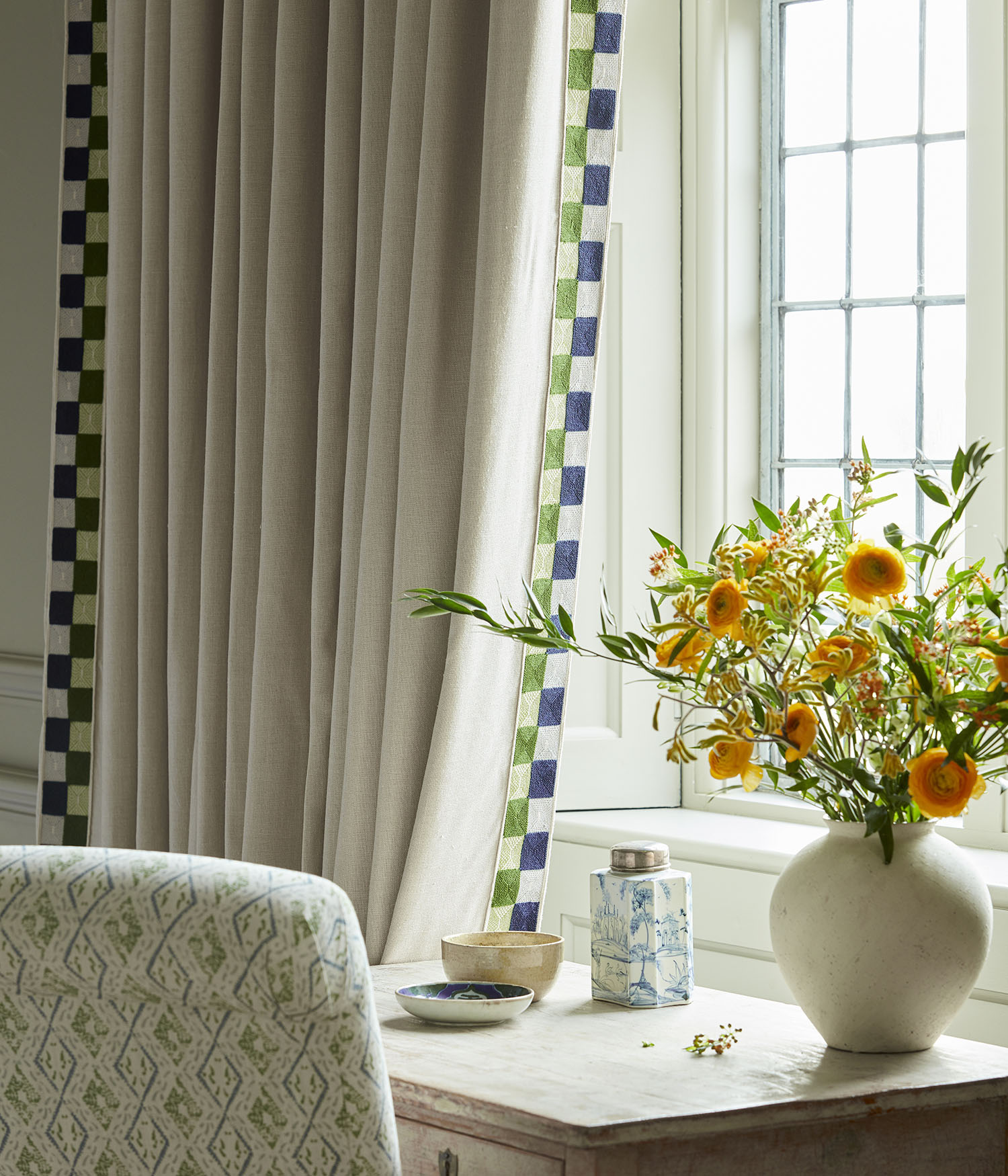 Using multi-colour chair stitch in a block colour geometric design in matt yarns, this fun braid will bring a focal point in an interior. A striking trim that has the texture of wool.