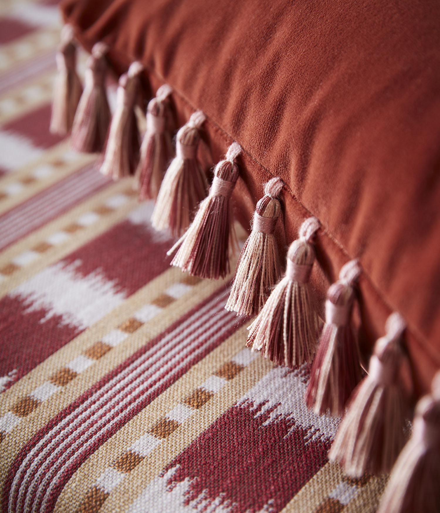 A pretty tassel fringe trim with multi-colour elements set from a subtle zig zag woven heading. The design mixes matt and shiny yarns for extra detail that will enhance edges wherever it is used. Inspired by the howdah or elephant carriage which often has fringed canopy edges.