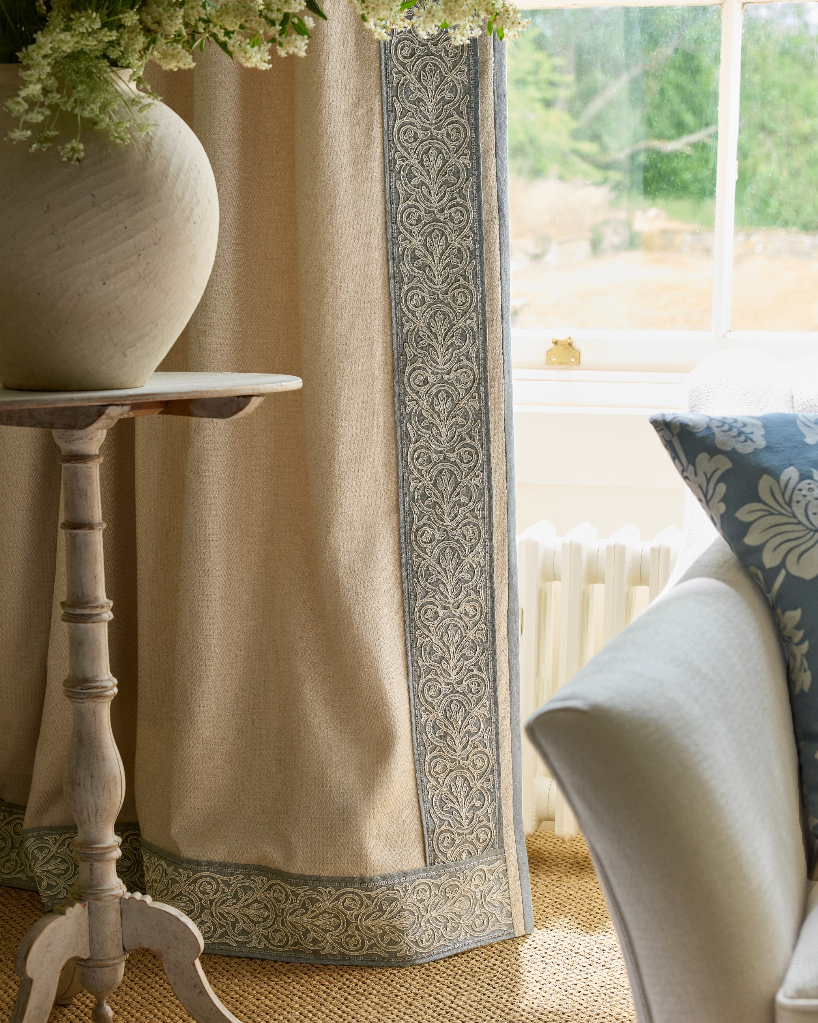 Intricately embroidered and corded with baroque scrolls and delicate curves, this luxurious braid captures the ornate elegance of the Rococo era. Perfect for adding a touch of opulence to drapery or upholstery, it elevates interiors with its richly decorative detail.
