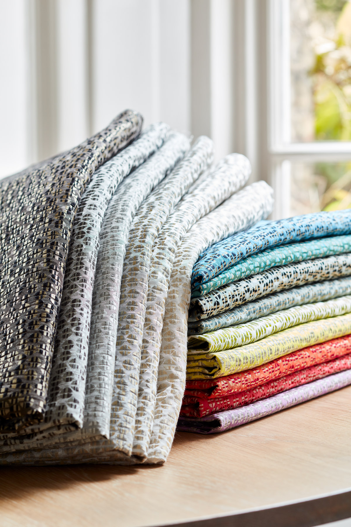 Luxurious semi-plain in multiple colourways. Continuing the James Hare theme of semi-plains, Solitaire is ideal for introducing colour and fun into a scheme. The broken opalescent circle shapes appear to float above the grosgrain ground. Available in a kaleidoscope of shades, the sophisticated design comes in a colour palette that breaks the rules.