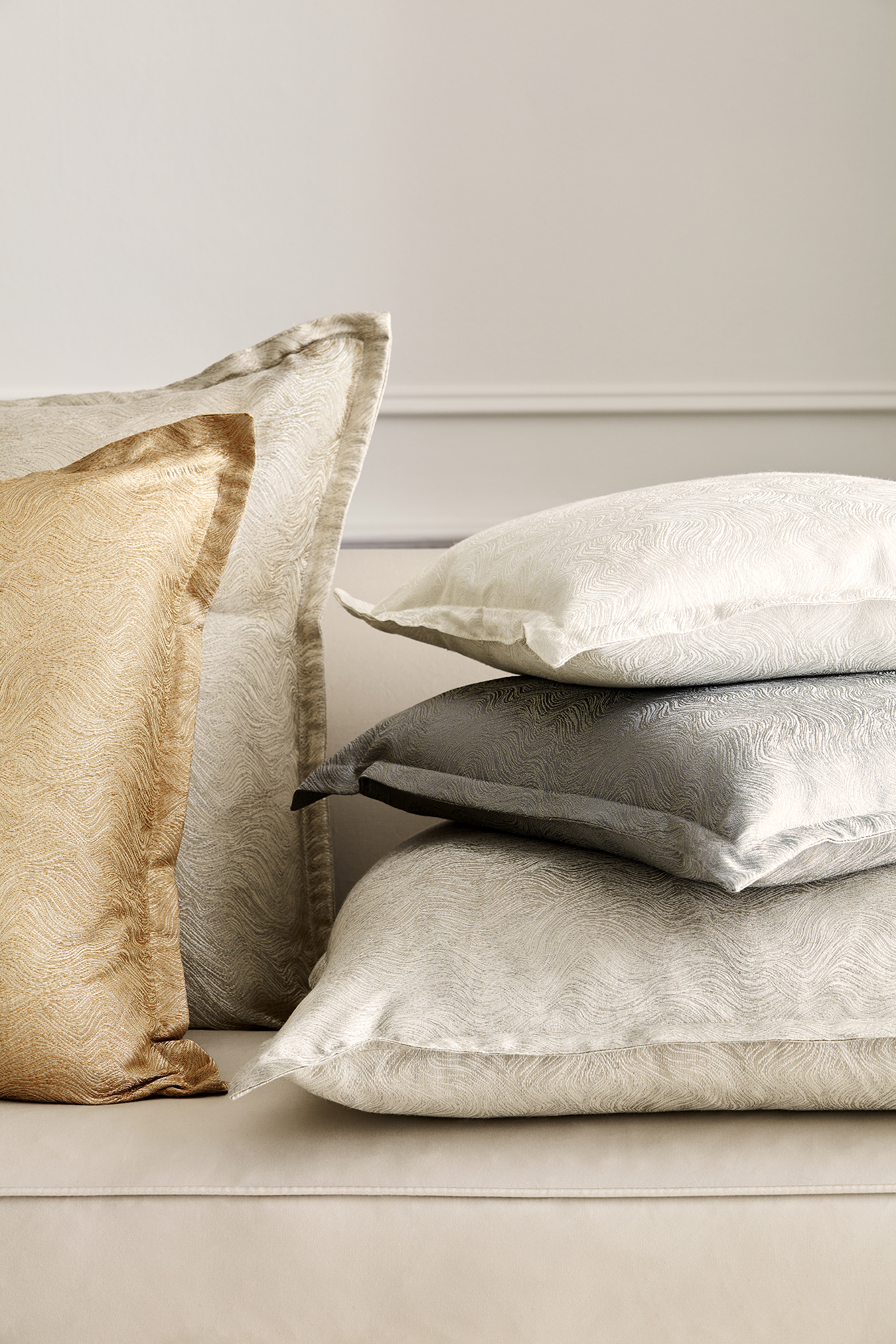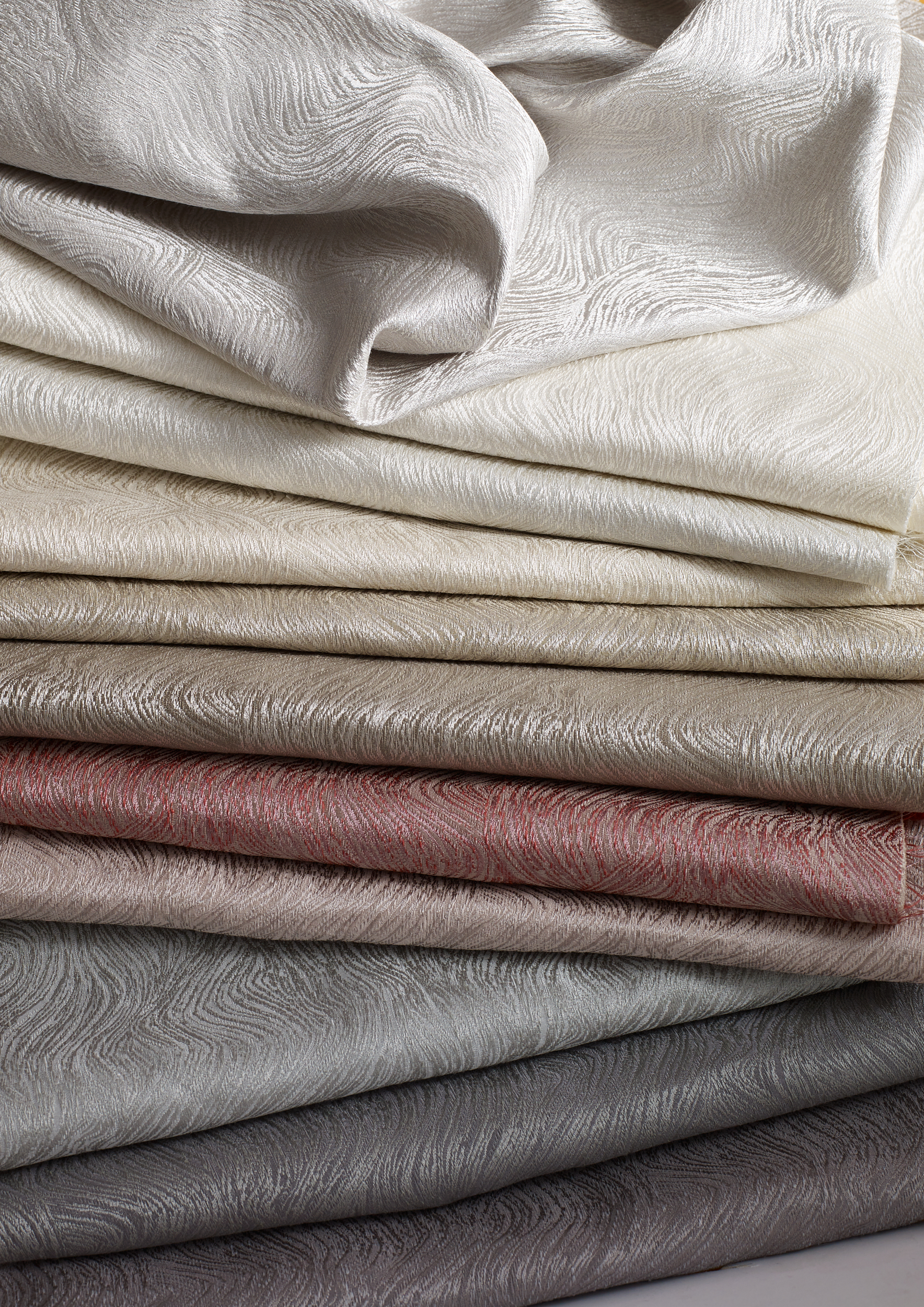 Inspired by rock formations, this woven jacquard semi-plain silk has a soft textural surface of undulating waves with matt and lustre effects. A beautiful handle with soft drape in a subtle colour palette, this stand alone collection is the latest addition to the James Hare semi-plain ranges.